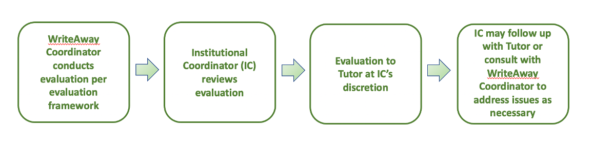 The WriteAway Coordinator will communicate to institutional coordinators how tutors are meeting WriteAway expectations by reviewing tutor responses, developing feedback, and submitting this feedback to the institutional coordinator. With direction from the institutional coordinator, the WriteAway Coordinator may work with tutors to bring their work up to the standards provided by the WriteAway tutor competencies. If institutional coordinators wish to, they may conduct tutor evaluations in addition to to the feedback provided by the WriteAway Coordinator.